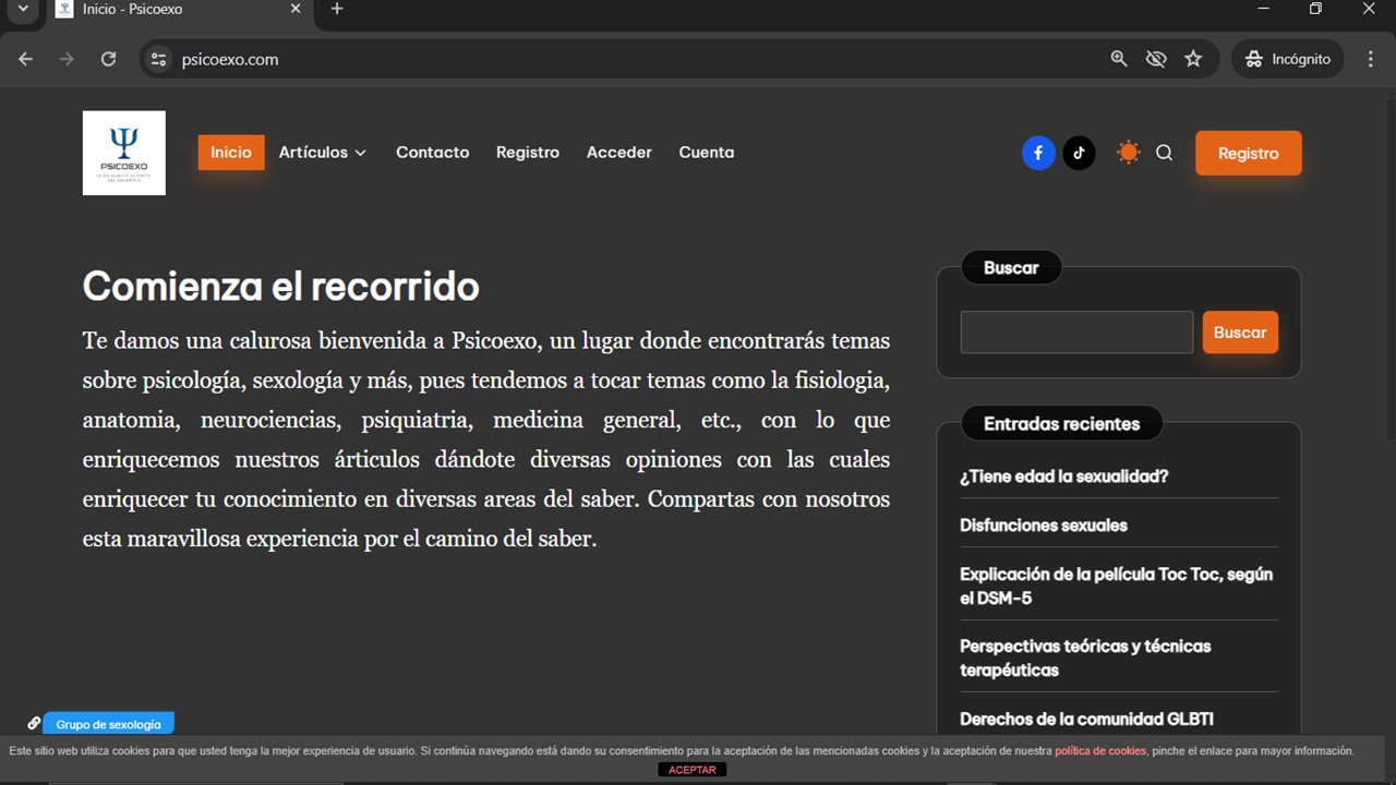 Te damos una calurosa bienvenida a Psicoexo.com, un espacio en donde encontrarás temas interesantes y actualizados sobre psicología, sexología fundamentalmente, pero también relacionados con fisiología, anatomía, neurociencias, psiquiatría, medicina general, etc.